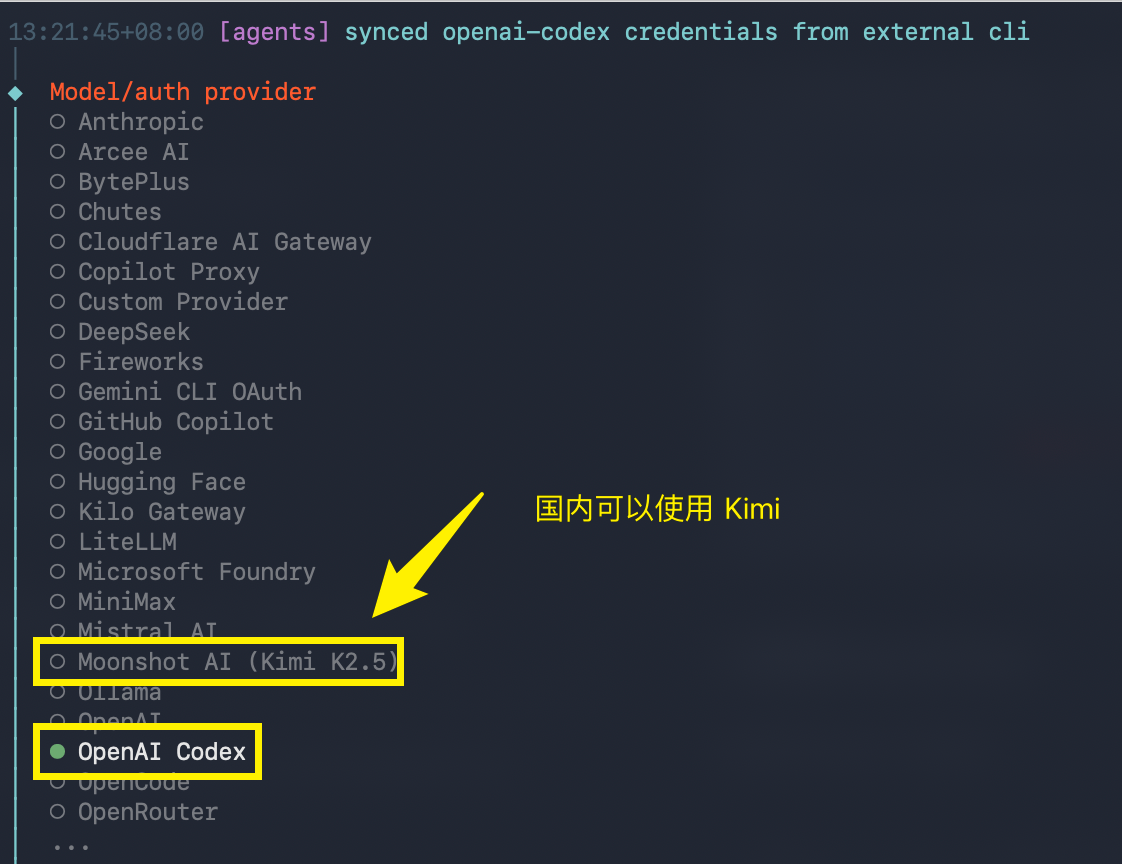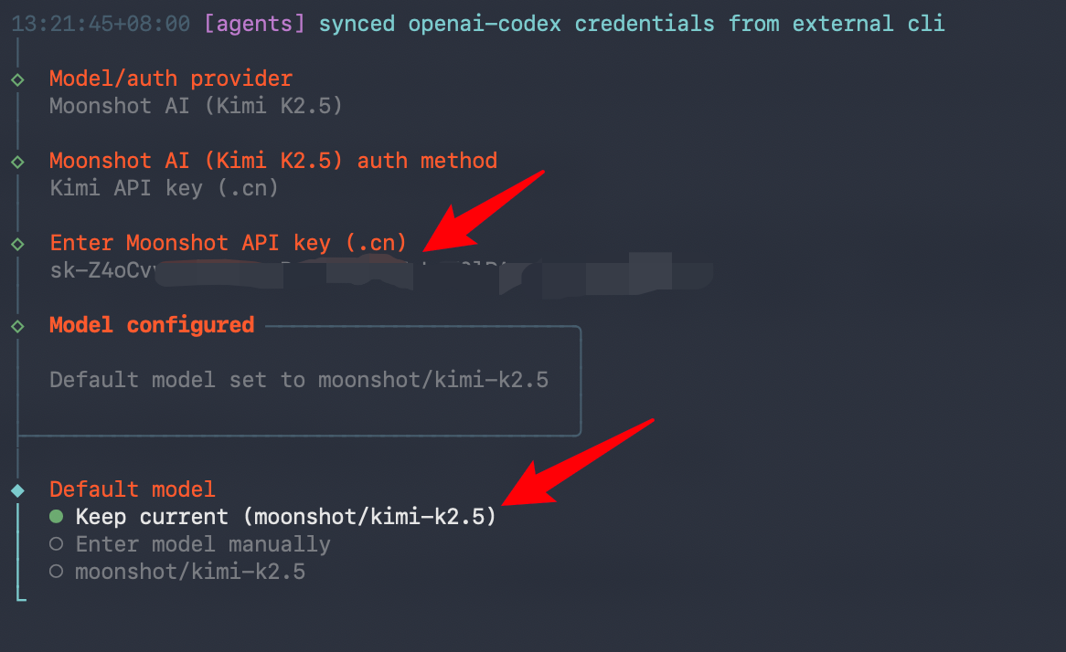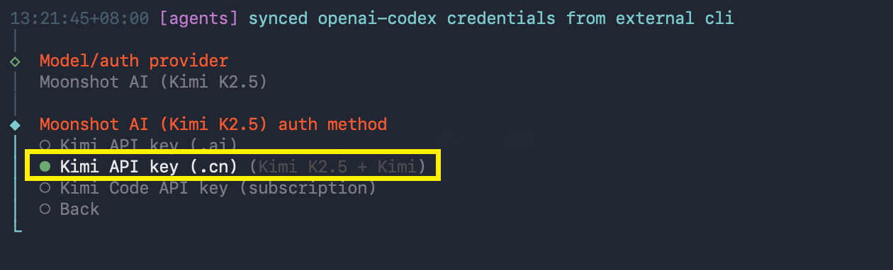 下一步选择我们要使用的大模型,我Kimi2.5 为例,选择 cn 选项