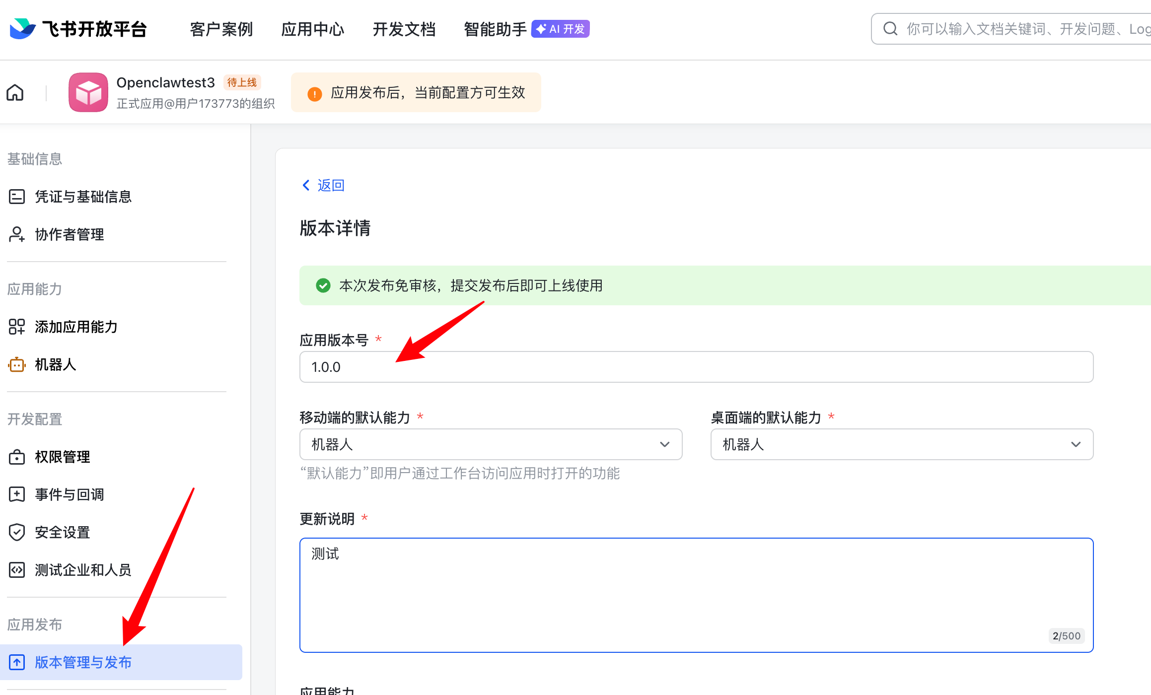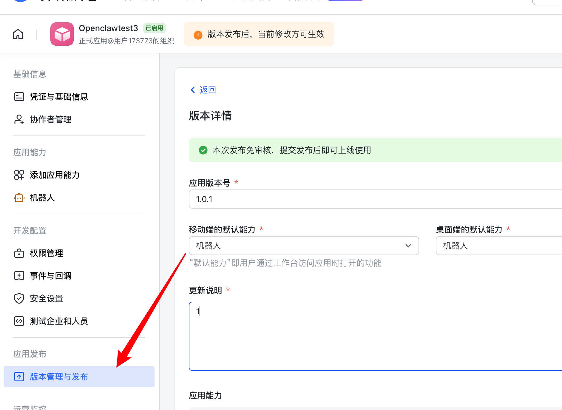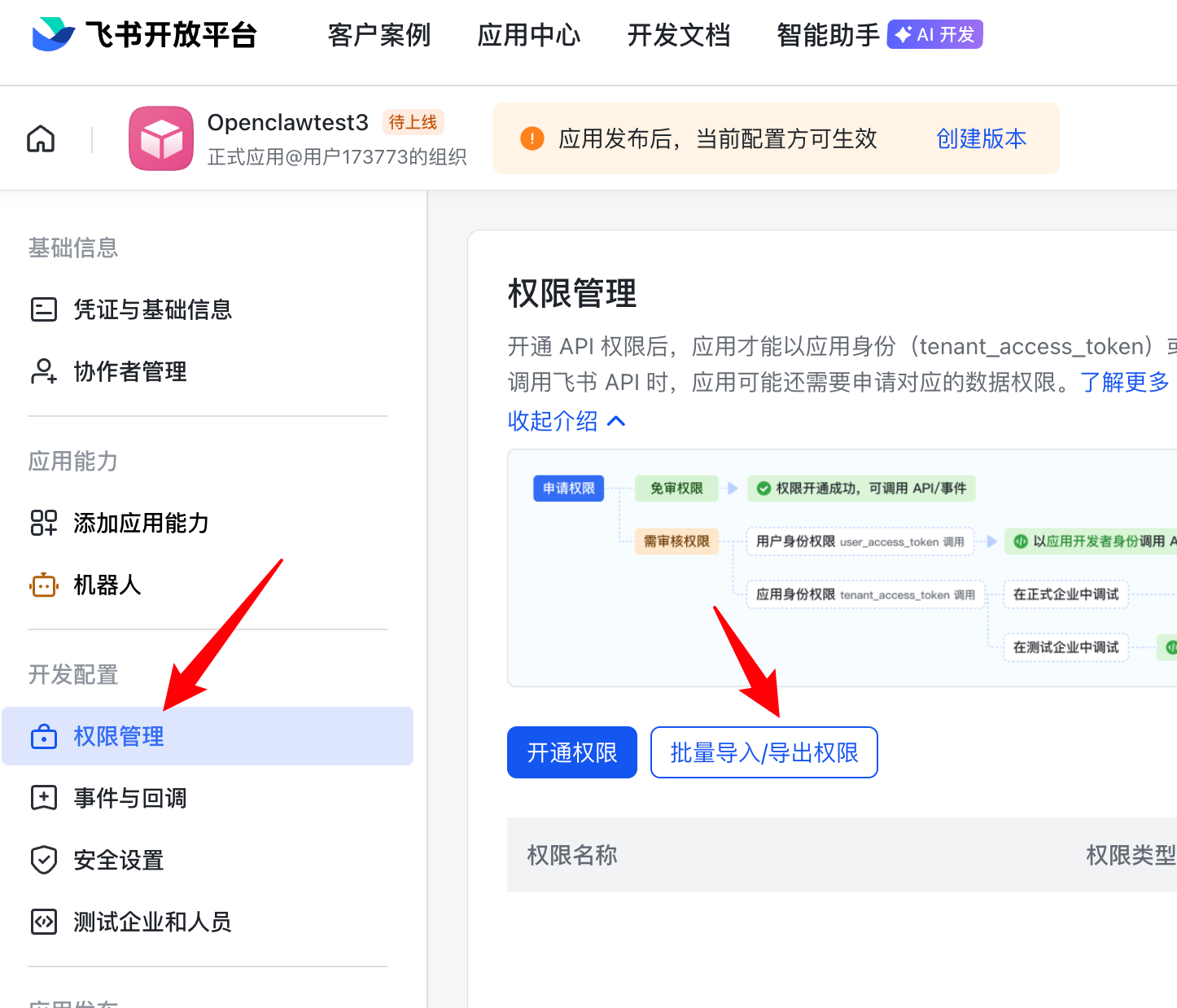 先删除原有代码,把以下代码粘贴进去:1 2 3 4 5 6 7 8 9 10 11 12 13 14 15 16 17 18 19 20 21 22 23 24 25 26 27 28 29 30 31 32 33 34 35 36 37 38 39 40 41 42 43 44 45 46 47 48 49 50 51 52 53 54 55 56 57 58 59 60 61 62 63 64 65 66 67 68 69 70 71 72 73 74 75 76 77 78 79 80 81 82 83 84 85 86 87 88 89 90 91 92 93 94 95 96 97 98 99 100 101 102 103 104 105 106 107 108 109 110 111 112 113 114 115 116 117 118 119 120 121 122 123 124 125 126 127 128 129 130 131 132 133 134 135 136 137 138 139 140 141 142 143 144 145 146 147 148 149 150 151 152 153 154 155 156 157 158 159 160 161 162 163 164 165 166 167 168 169 170 171 172 173 174 175 176 177 178 179 180{ "scopes": { "tenant": [ "base:app:copy", "base:app:create", "base:app:read", "base:app:update", "base:collaborator:create", "base:collaborator:delete", "base:collaborator:read", "base:dashboard:copy", "base:dashboard:read", "base:field:create", "base:field:delete", "base:field:read", "base:field:update", "base:form:read", "base:form:update", "base:record:create", "base:record:delete", "base:record:read", "base:record:retrieve", "base:record:update", "base:role:create", "base:role:delete", "base:role:read", "base:role:update", "base:table:create", "base:table:delete", "base:table:read", "base:table:update", "base:view:read", "base:view:write_only", "bitable:app", "bitable:app:readonly", "board:whiteboard:node:create", "board:whiteboard:node:delete", "board:whiteboard:node:read", "board:whiteboard:node:update", "contact:contact.base:readonly", "contact:user.base:readonly", "contact:user.employee_id:readonly", "contact:user.employee_number:read", "contact:user.id:readonly", "docs:doc", "docs:doc:readonly", "docs:document.comment:create", "docs:document.comment:read", "docs:document.comment:update", "docs:document.comment:write_only", "docs:document.content:read", "docs:document.media:download", "docs:document.media:upload", "docs:document.subscription", "docs:document.subscription:read", "docs:document:copy", "docs:document:export", "docs:document:import", "docs:event.document_deleted:read", "docs:event.document_edited:read", "docs:event.document_opened:read", "docs:event:subscribe", "docs:permission.member", "docs:permission.member:auth", "docs:permission.member:create", "docs:permission.member:delete", "docs:permission.member:readonly", "docs:permission.member:retrieve", "docs:permission.member:transfer", "docs:permission.member:update", "docs:permission.setting", "docs:permission.setting:read", "docs:permission.setting:readonly", "docs:permission.setting:write_only", "docx:document", "docx:document.block:convert", "docx:document:create", "docx:document:readonly", "drive:drive", "drive:drive.metadata:readonly", "drive:drive.search:readonly", "drive:drive:readonly", "drive:drive:version", "drive:drive:version:readonly", "drive:export:readonly", "drive:file", "drive:file.like:readonly", "drive:file.meta.sec_label.read_only", "drive:file:download", "drive:file:readonly", "drive:file:upload", "drive:file:view_record:readonly", "event:ip_list", "im:app_feed_card:write", "im:biz_entity_tag_relation:read", "im:biz_entity_tag_relation:write", "im:chat", "im:chat.access_event.bot_p2p_chat:read", "im:chat.announcement:read", "im:chat.announcement:write_only", "im:chat.chat_pins:read", "im:chat.chat_pins:write_only", "im:chat.collab_plugins:read", "im:chat.collab_plugins:write_only", "im:chat.managers:write_only", "im:chat.members:bot_access", "im:chat.members:read", "im:chat.members:write_only", "im:chat.menu_tree:read", "im:chat.menu_tree:write_only", "im:chat.moderation:read", "im:chat.tabs:read", "im:chat.tabs:write_only", "im:chat.top_notice:write_only", "im:chat.widgets:read", "im:chat.widgets:write_only", "im:chat:create", "im:chat:delete", "im:chat:moderation:write_only", "im:chat:operate_as_owner", "im:chat:read", "im:chat:readonly", "im:chat:update", "im:datasync.feed_card.time_sensitive:write", "im:message", "im:message.group_at_msg:readonly", "im:message.group_msg", "im:message.p2p_msg:readonly", "im:message.pins:read", "im:message.pins:write_only", "im:message.reactions:read", "im:message.reactions:write_only", "im:message.urgent", "im:message.urgent.status:write", "im:message.urgent:phone", "im:message.urgent:sms", "im:message:readonly", "im:message:recall", "im:message:send_as_bot", "im:message:send_multi_depts", "im:message:send_multi_users", "im:message:send_sys_msg", "im:message:update", "im:resource", "im:tag:read", "im:tag:write", "im:url_preview.update", "im:user_agent:read", "sheets:spreadsheet", "sheets:spreadsheet.meta:read", "sheets:spreadsheet.meta:write_only", "sheets:spreadsheet:create", "sheets:spreadsheet:read", "sheets:spreadsheet:readonly", "sheets:spreadsheet:write_only", "space:document.event:read", "space:document:delete", "space:document:move", "space:document:retrieve", "space:document:shortcut", "space:folder:create", "wiki:member:create", "wiki:member:retrieve", "wiki:member:update", "wiki:node:copy", "wiki:node:create", "wiki:node:move", "wiki:node:read", "wiki:node:retrieve", "wiki:node:update", "wiki:setting:read", "wiki:setting:write_only", "wiki:space:read", "wiki:space:retrieve", "wiki:space:write_only", "wiki:wiki", "wiki:wiki:readonly" ] } }然后点击申请开通,最后点击确认。 完成后再点击进入版本管理与发布: