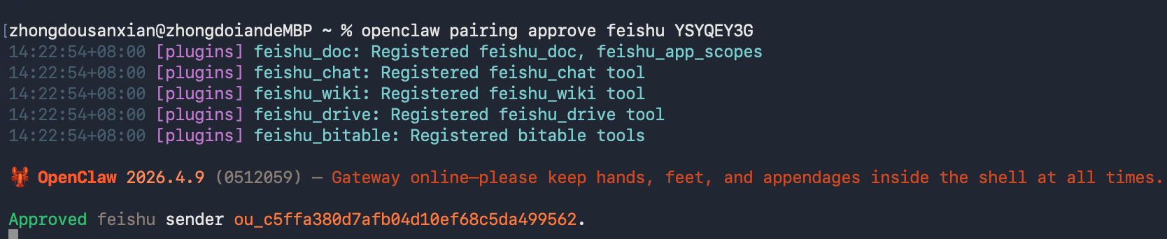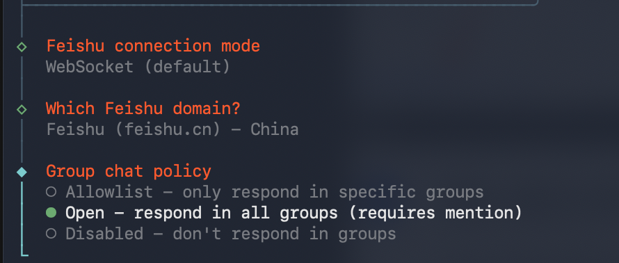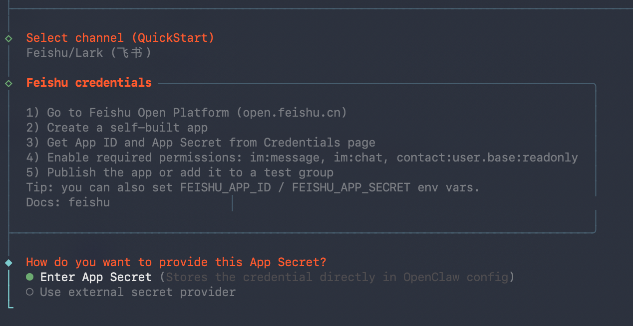 这一步,我们选择,飞书平台,配置好后我们就可以用手机吩咐龙虾干活了