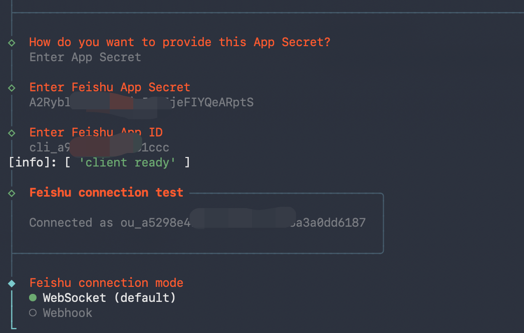 把凭证与基础信息里的应用凭证粘贴到终端中,根据提示先粘贴 Secret: