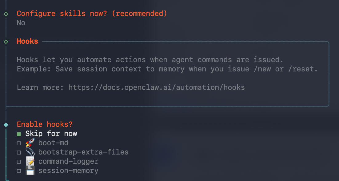 Skills,也先不用装,我们后面根据选择安装,hooks 也选择跳过,按以下空格键就表示选中: