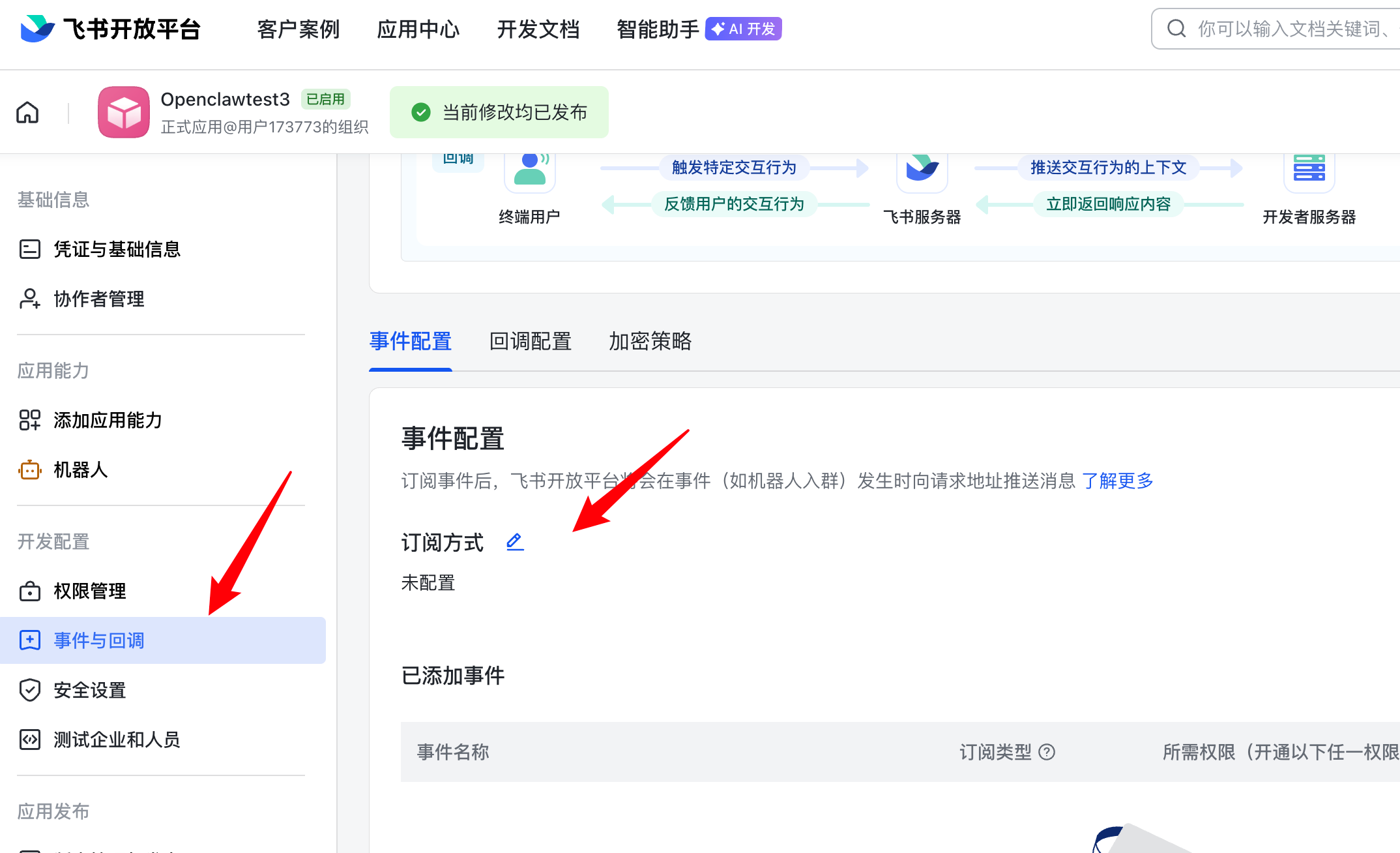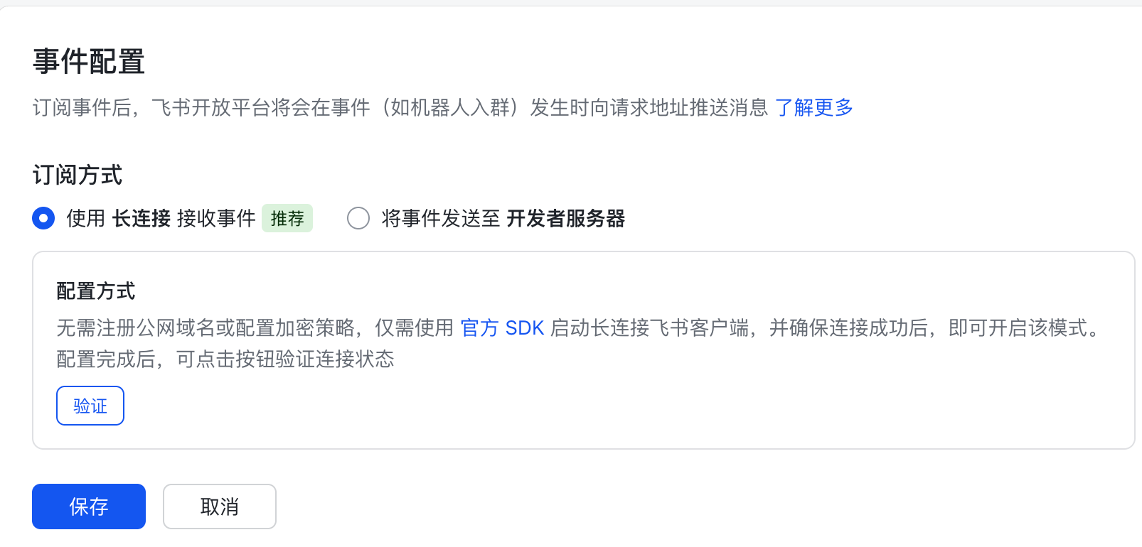 然后我们回到飞书,点击事件与回调,点击订阅方式,选择长连接点击保存: