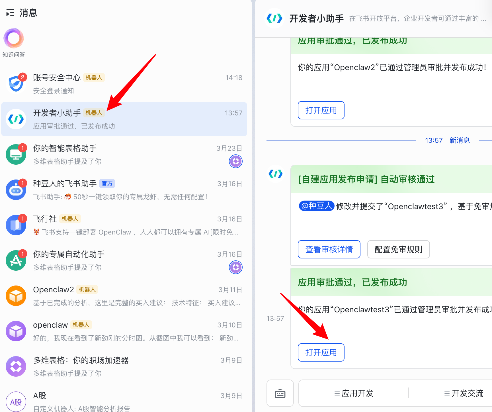 然后,打开飞书 APP,电脑端和手机端都可以,自己去下载,你会发现开发者小助手给你发来了消息,打开它,并且点击打开应用: