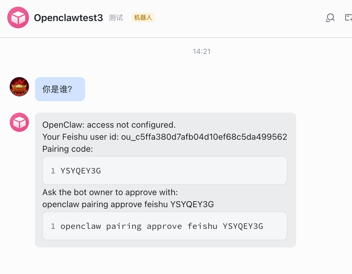 随便给它发个消息,他会返回你一串英文,复制最后这串代码到终端上执行以下:
